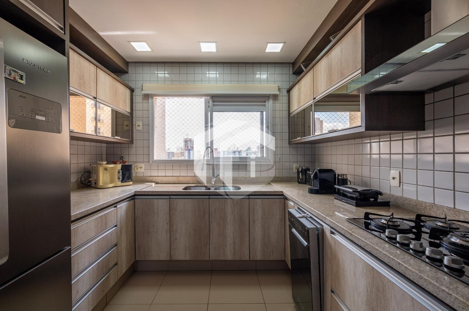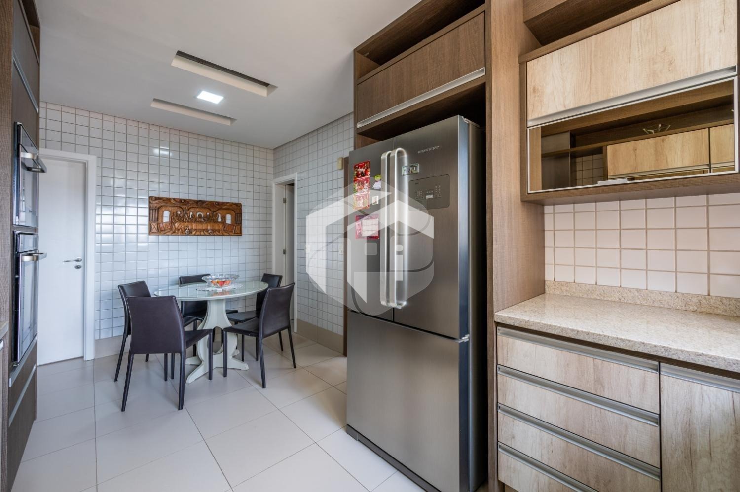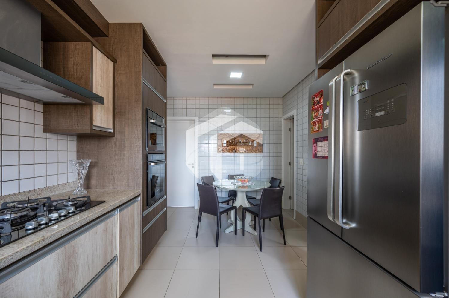 A cozinha ricamente planejada, completa com copa e despensa, oferece uma experiência culinária prática e funcional de alto nível.