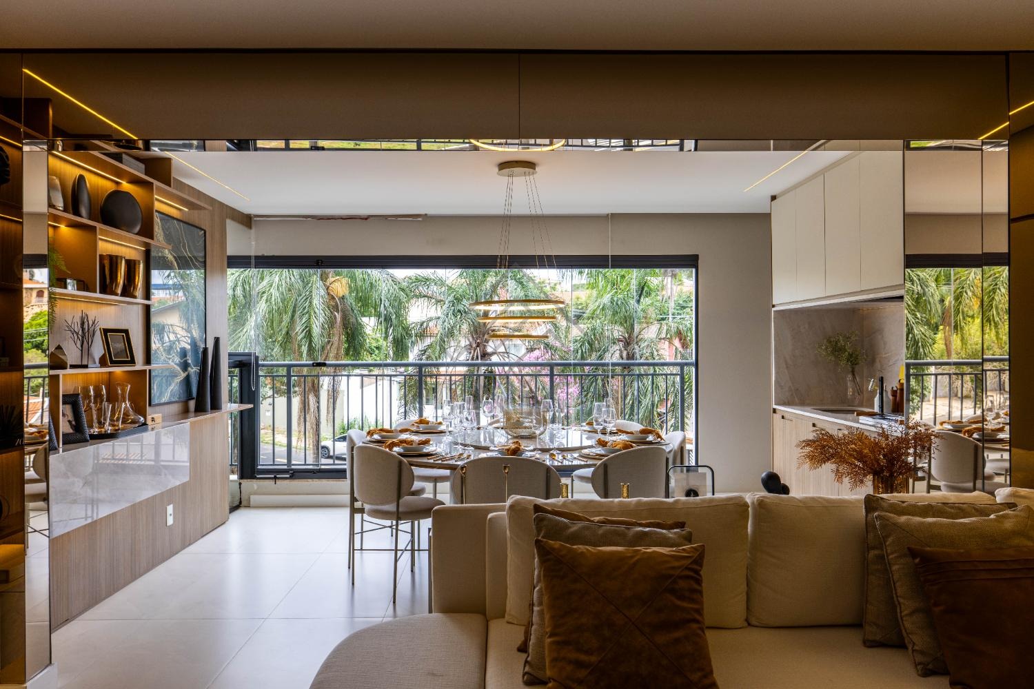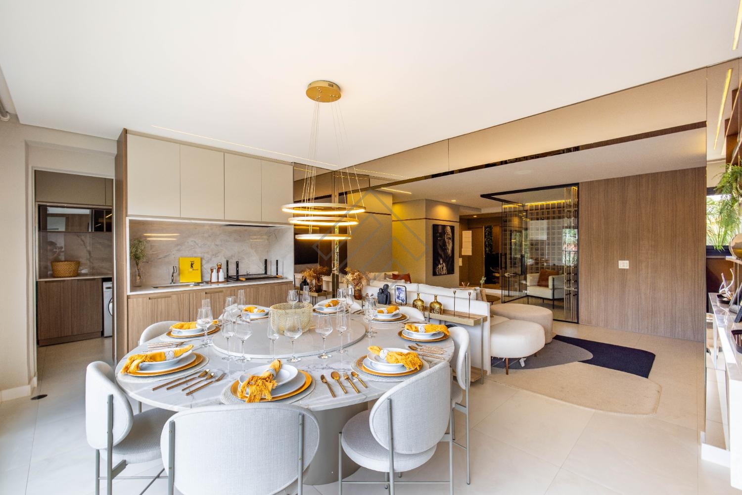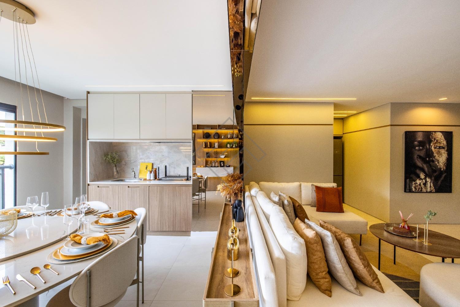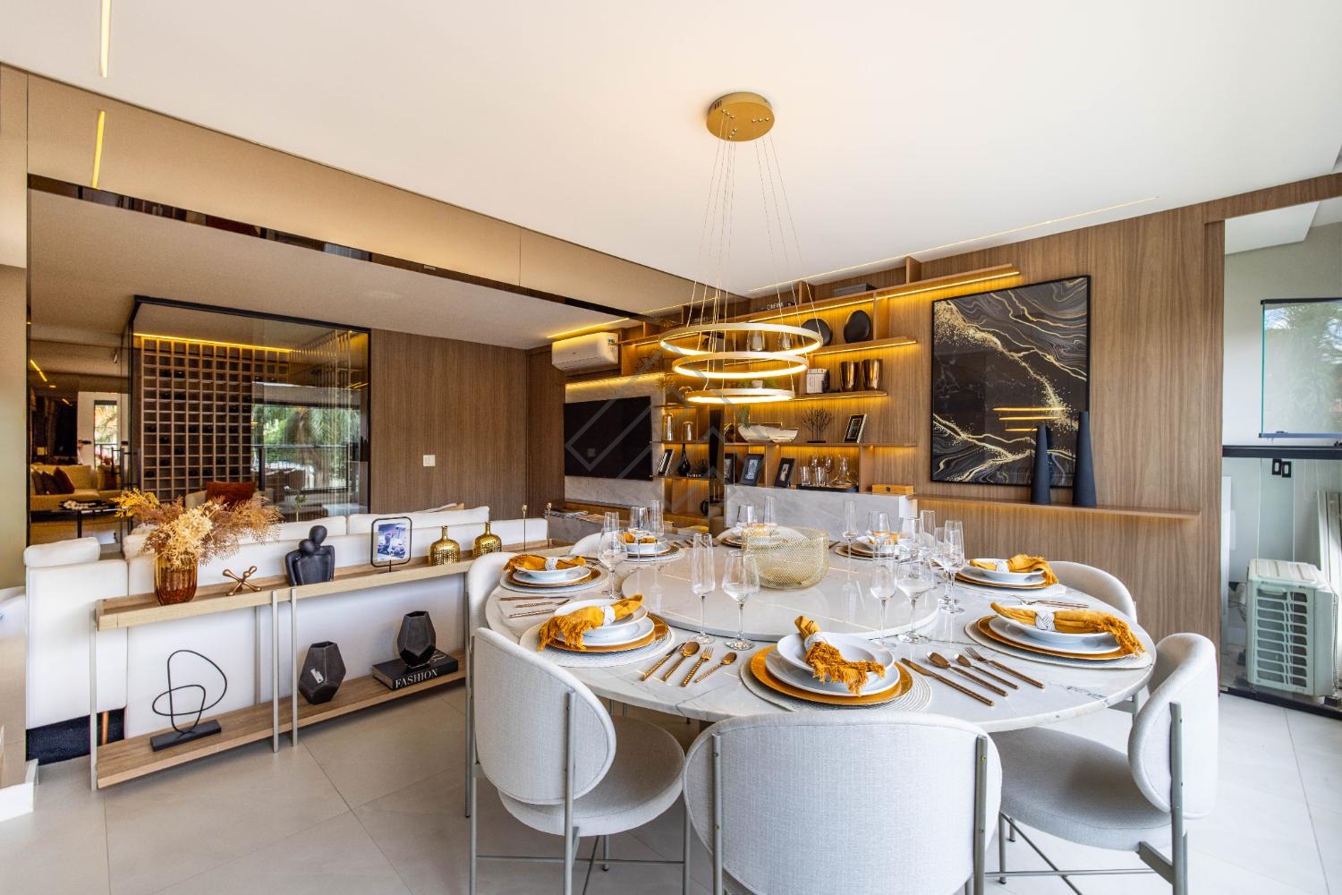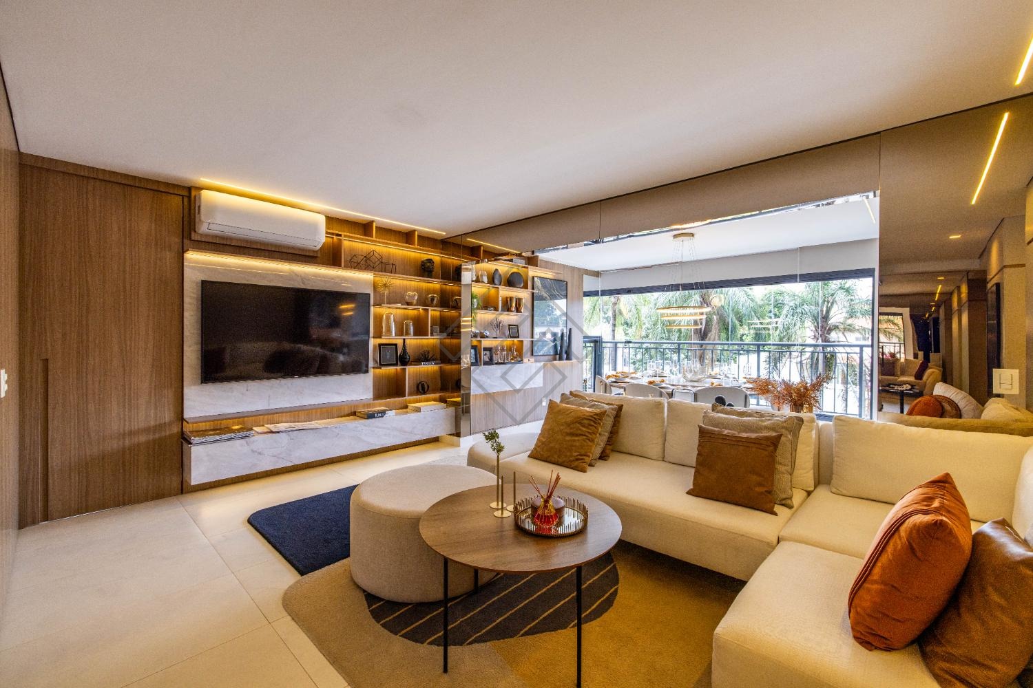 - Sala integrada com ambientes elegantes e iluminação planejada