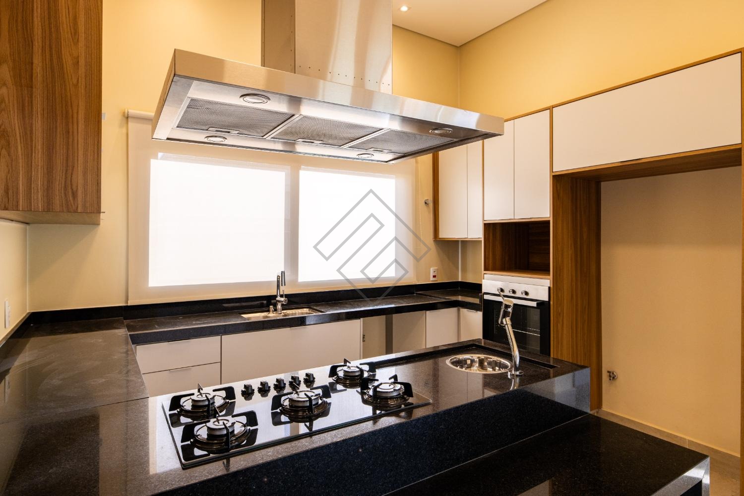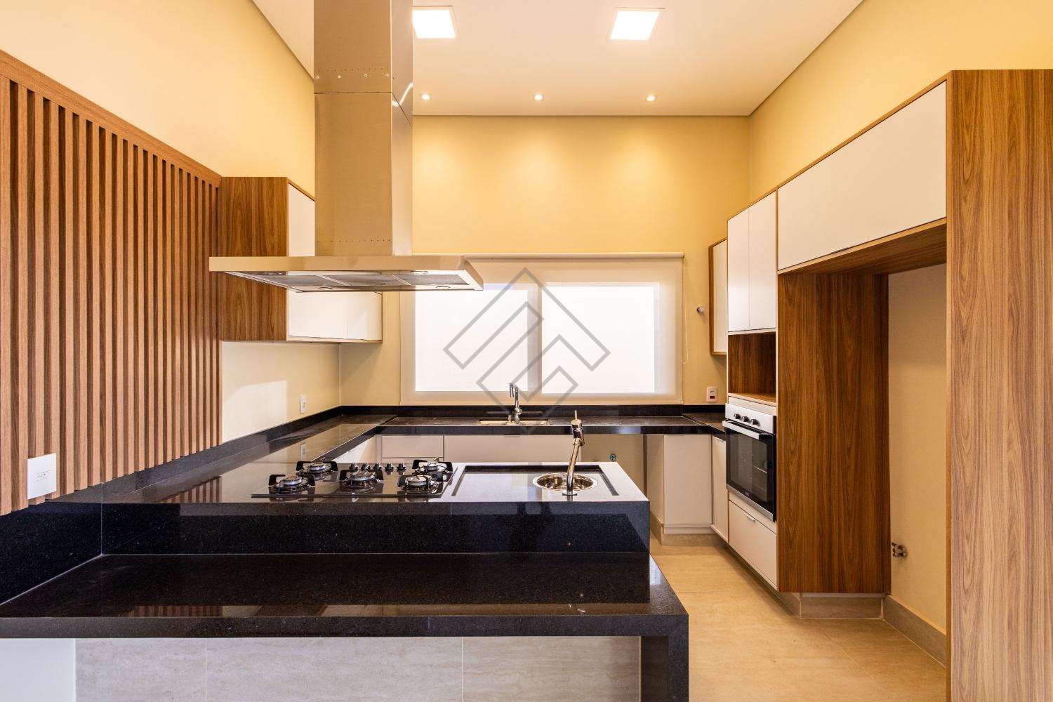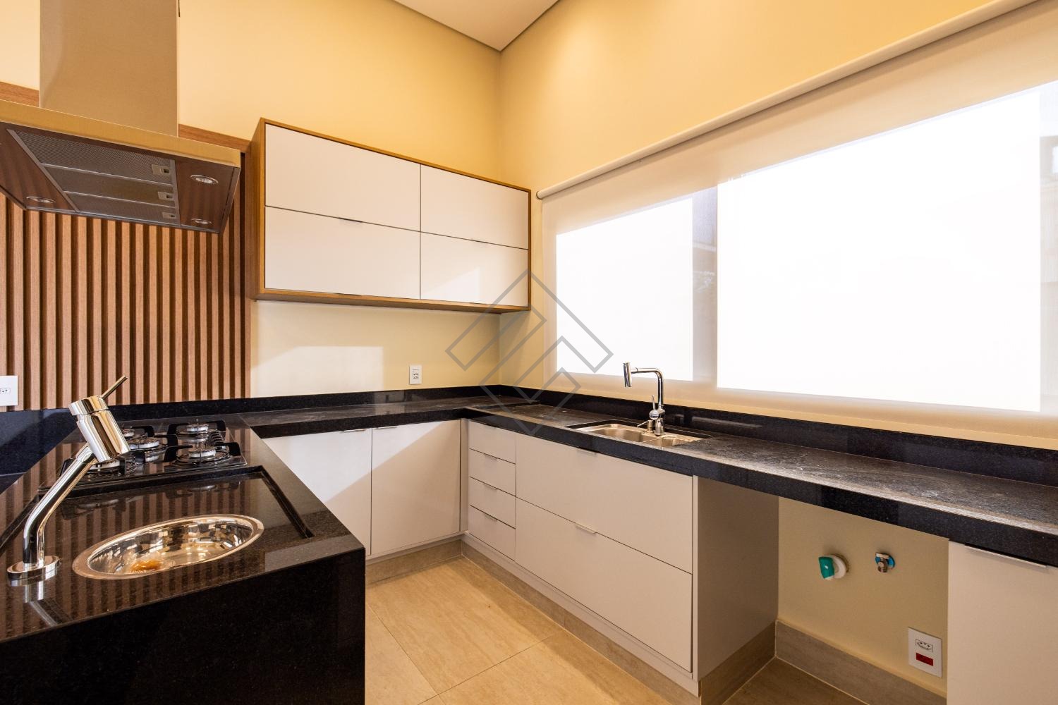 - Sala de estar e jantar com ambientes integrados, cozinha com armários planejados, cooktop e torre quente