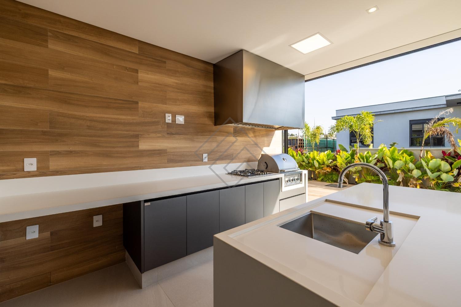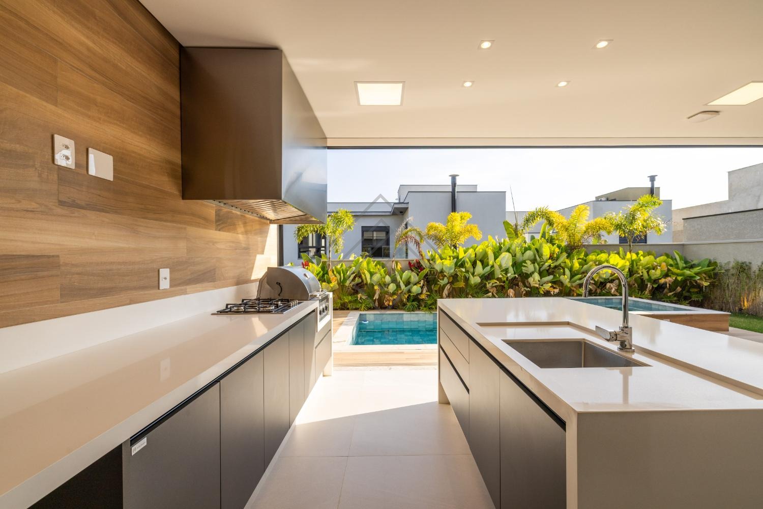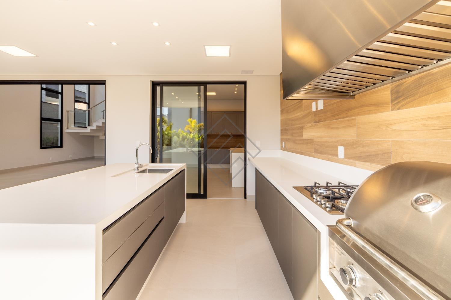 • Espaço gourmet fechado com churrasqueira a gás, cooktop e armários Kitchens