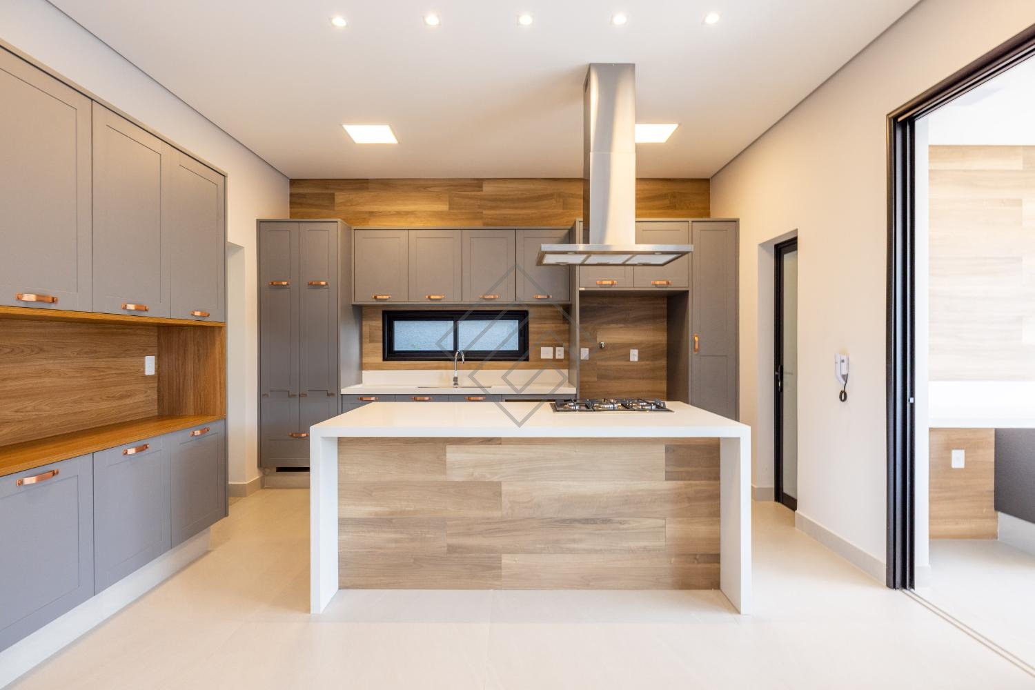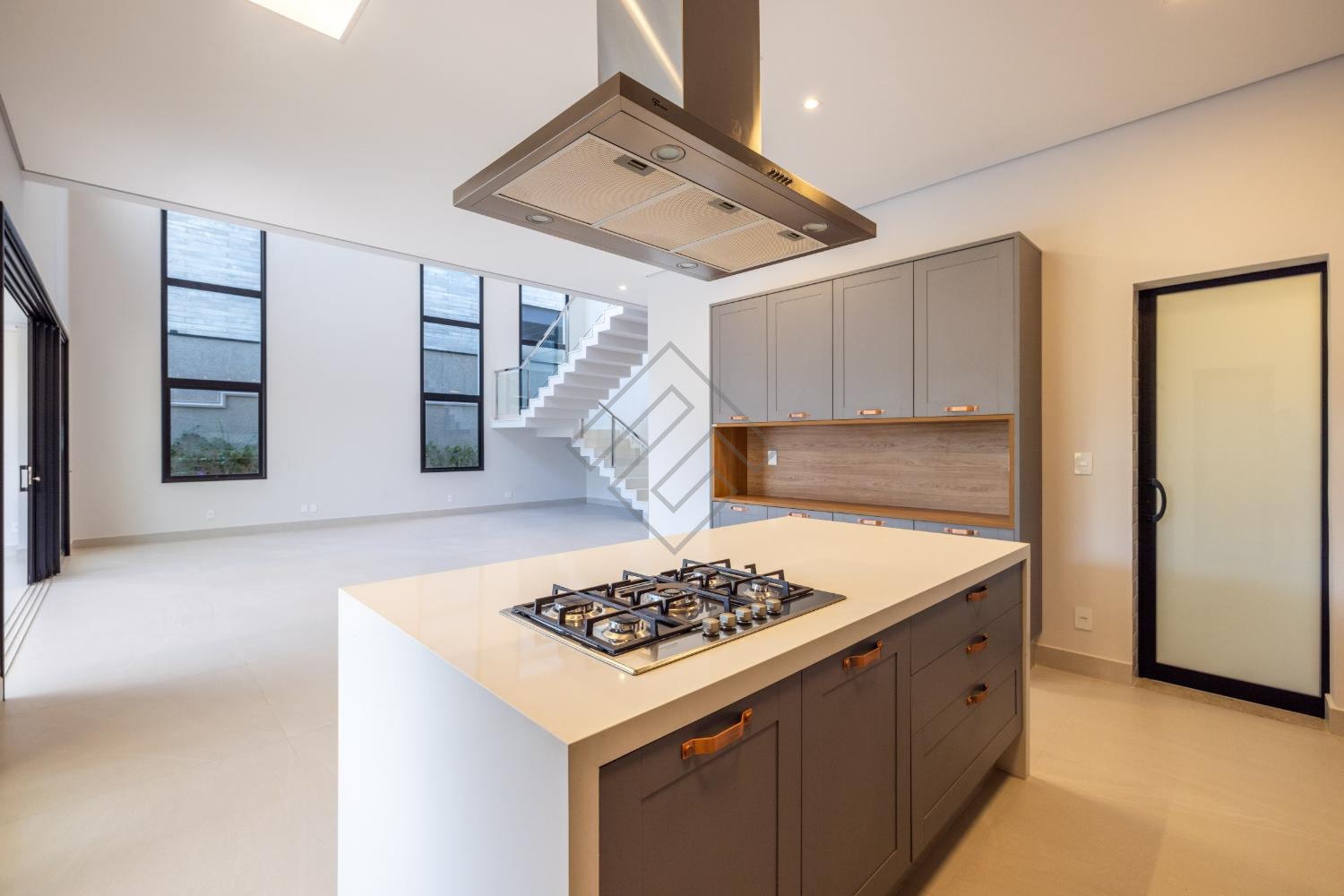 • Cozinha Kitchens equipada com cooktop, coifa de ilha e armários planejados