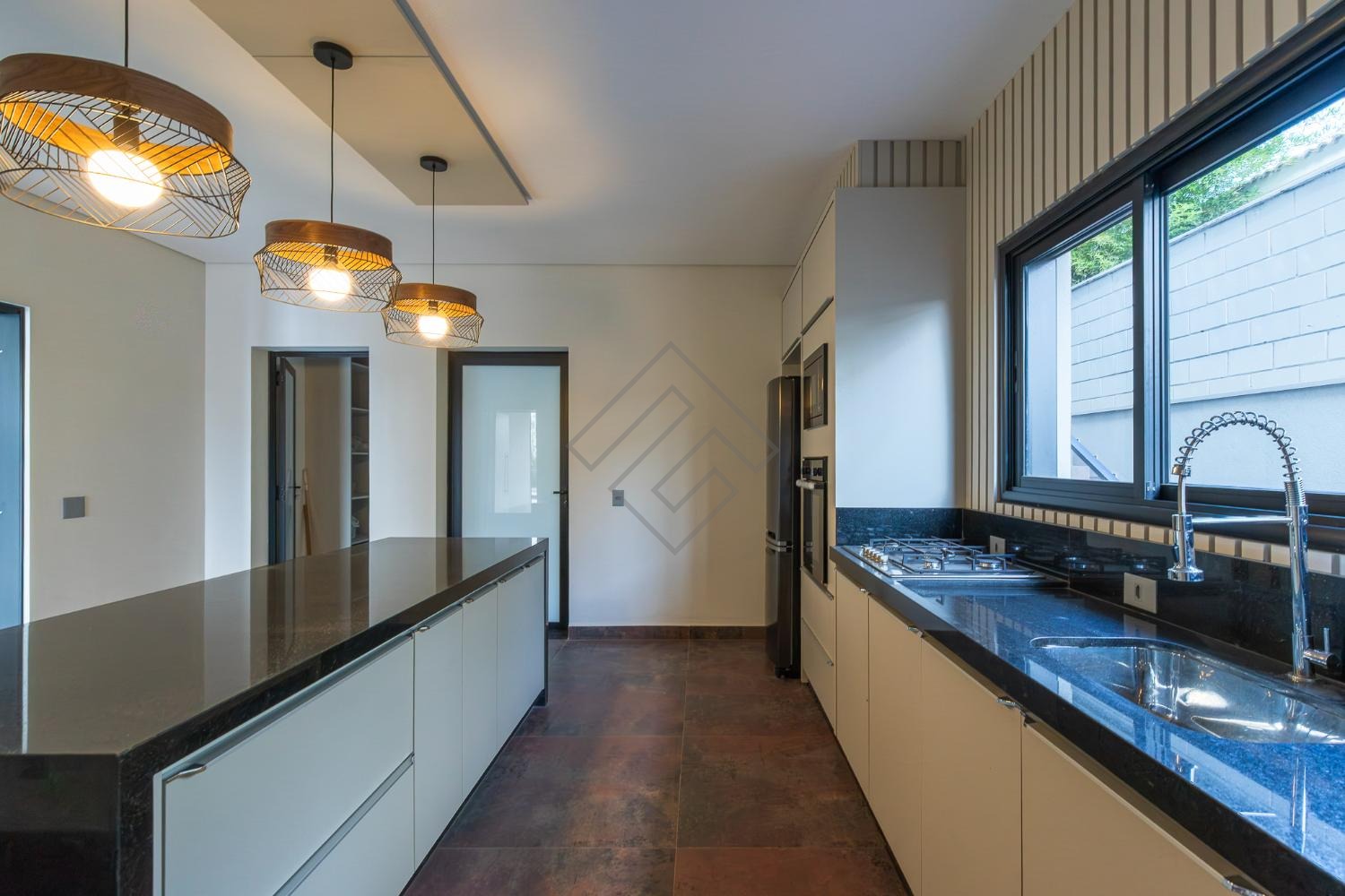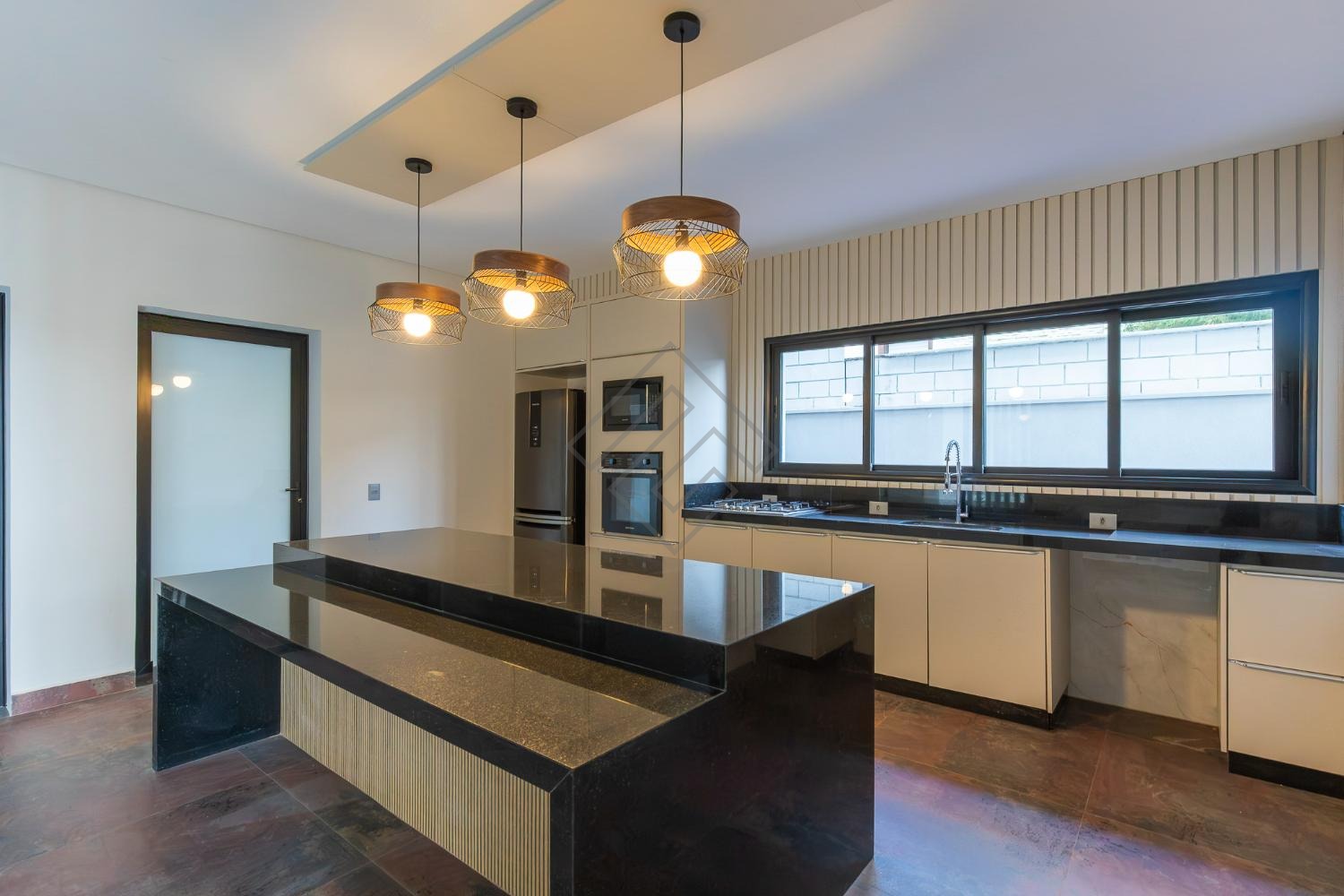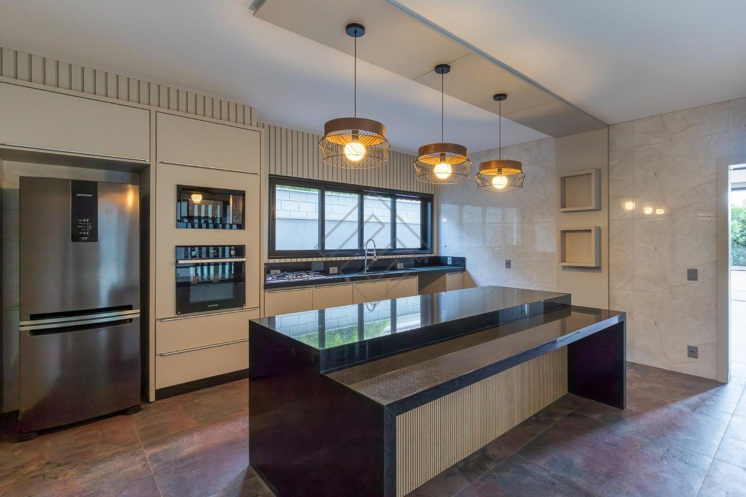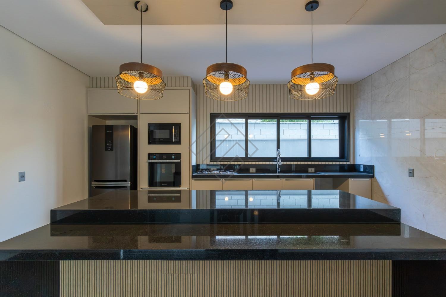 - Cozinha planejada com ilha, equipada com, cooktop e forno, micro-ondas e geladeira;