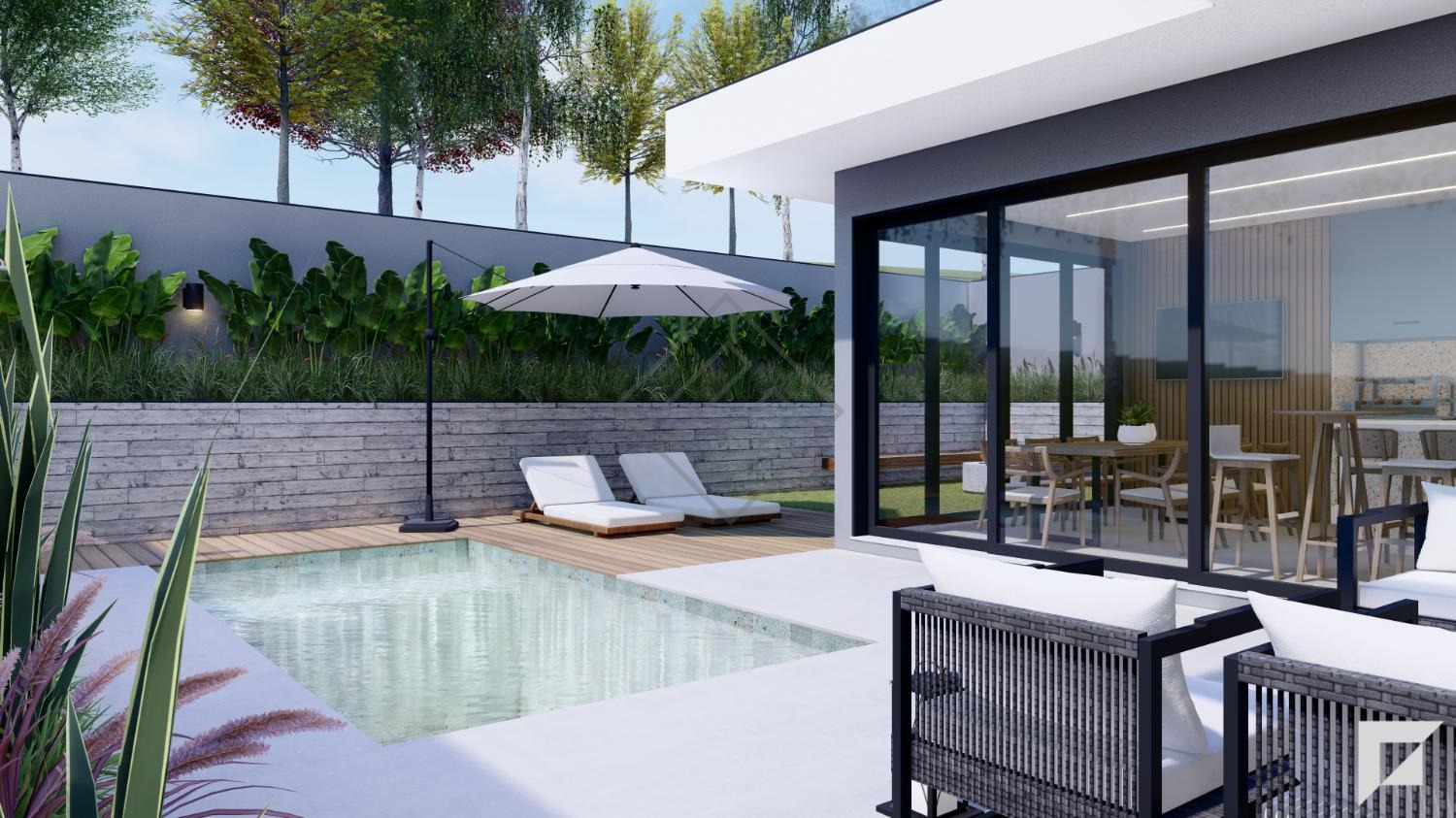 Área externa com piscina aquecida e banheiro de apoio. Residência totalmente automatizada (iluminação, climatização, sonorização e persianas), aquecimento solar, projeto luminotécnico e acabamento premium.