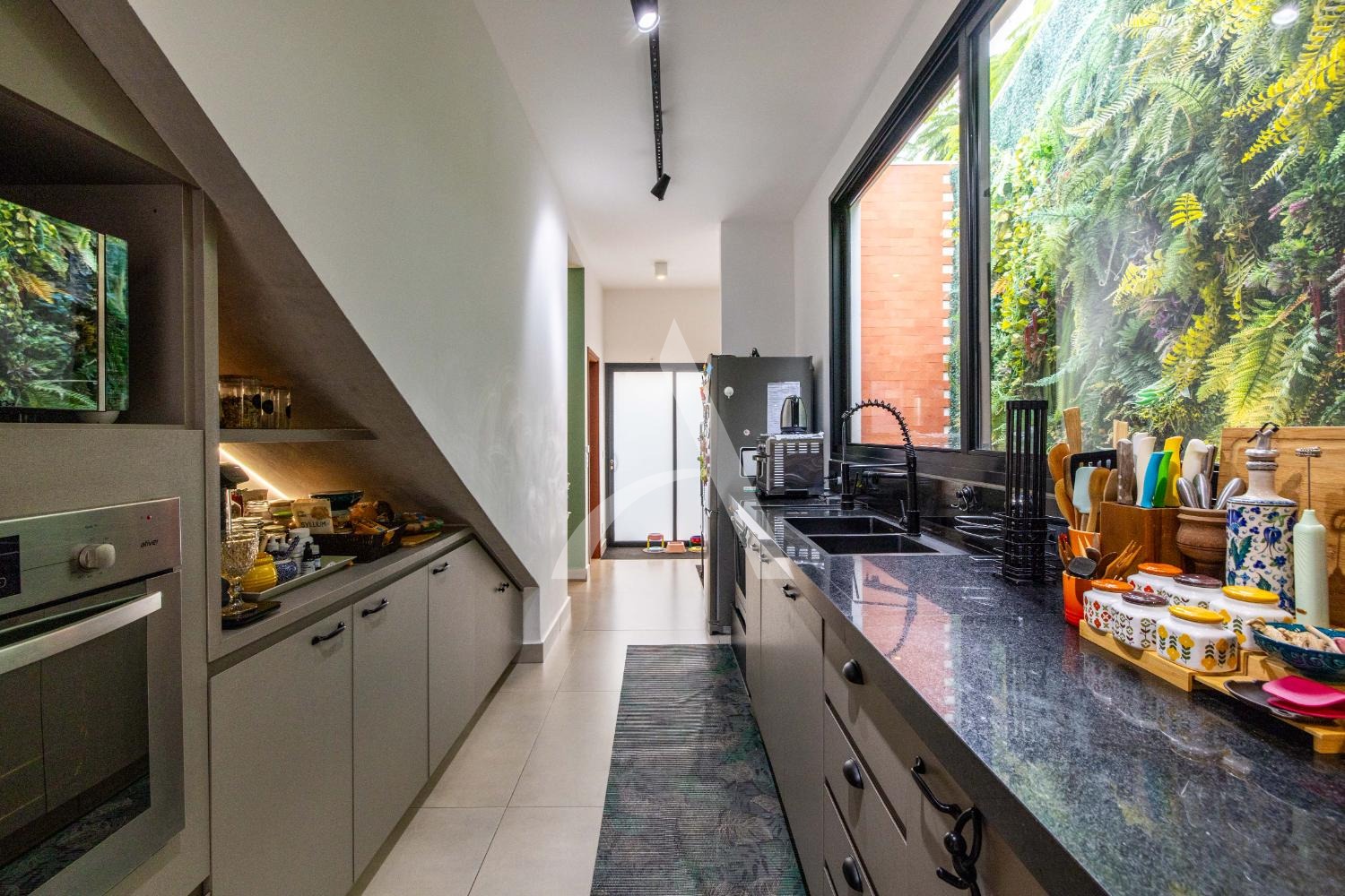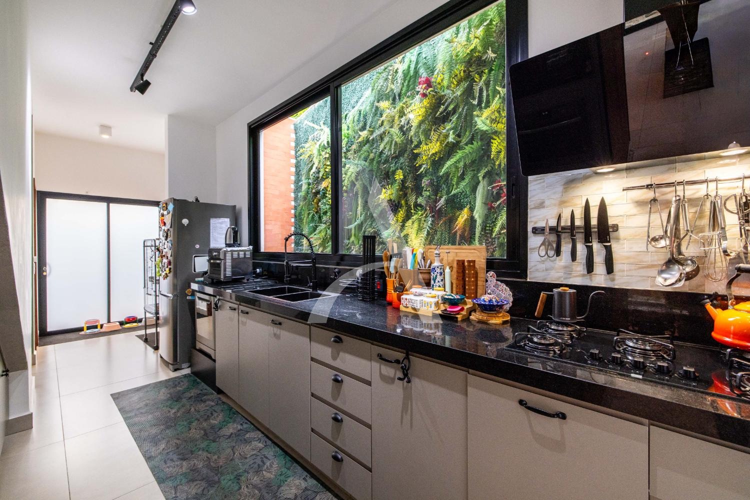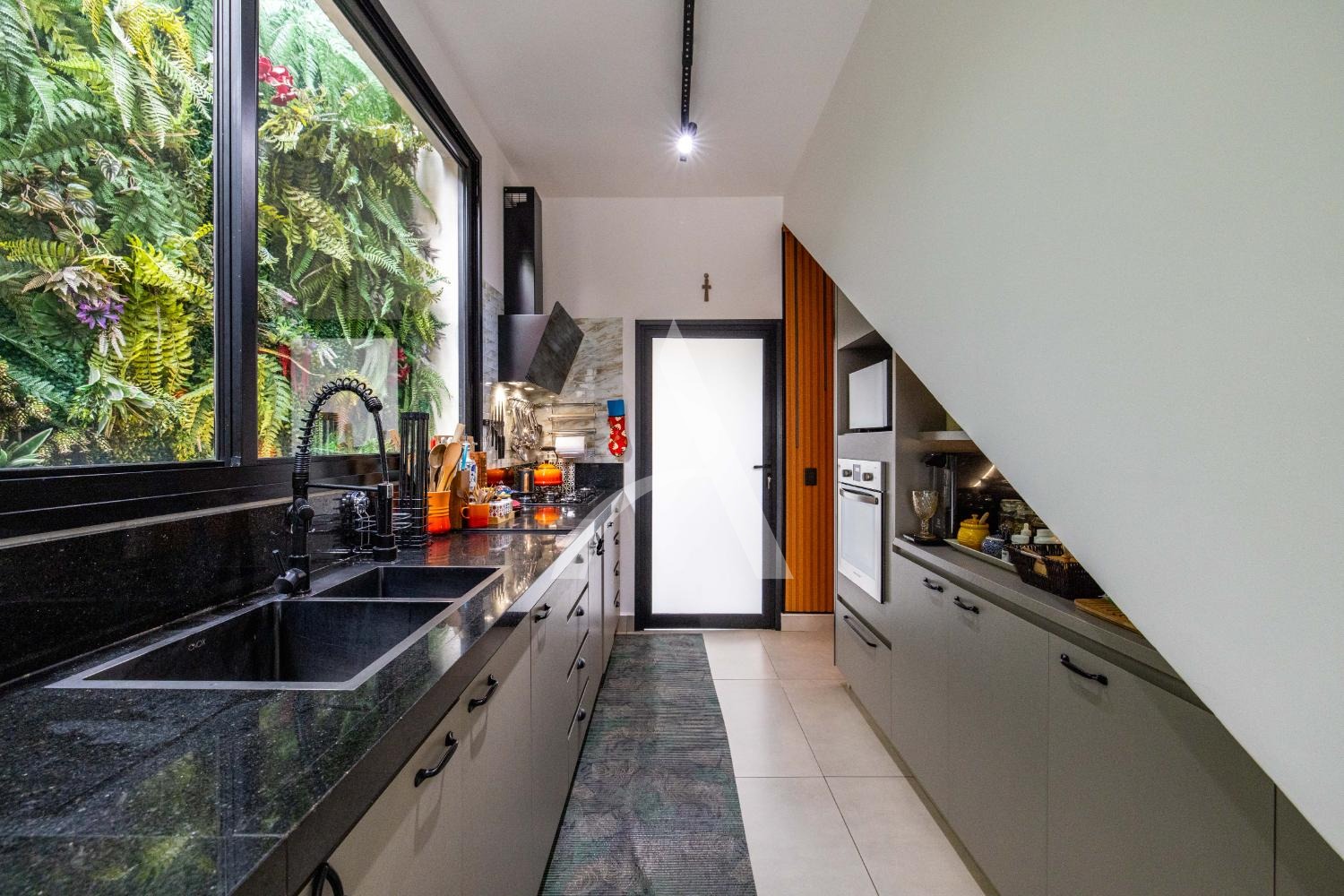 - Cozinha vasta em armários planejados e equipada com coifa, cooktop e forno.